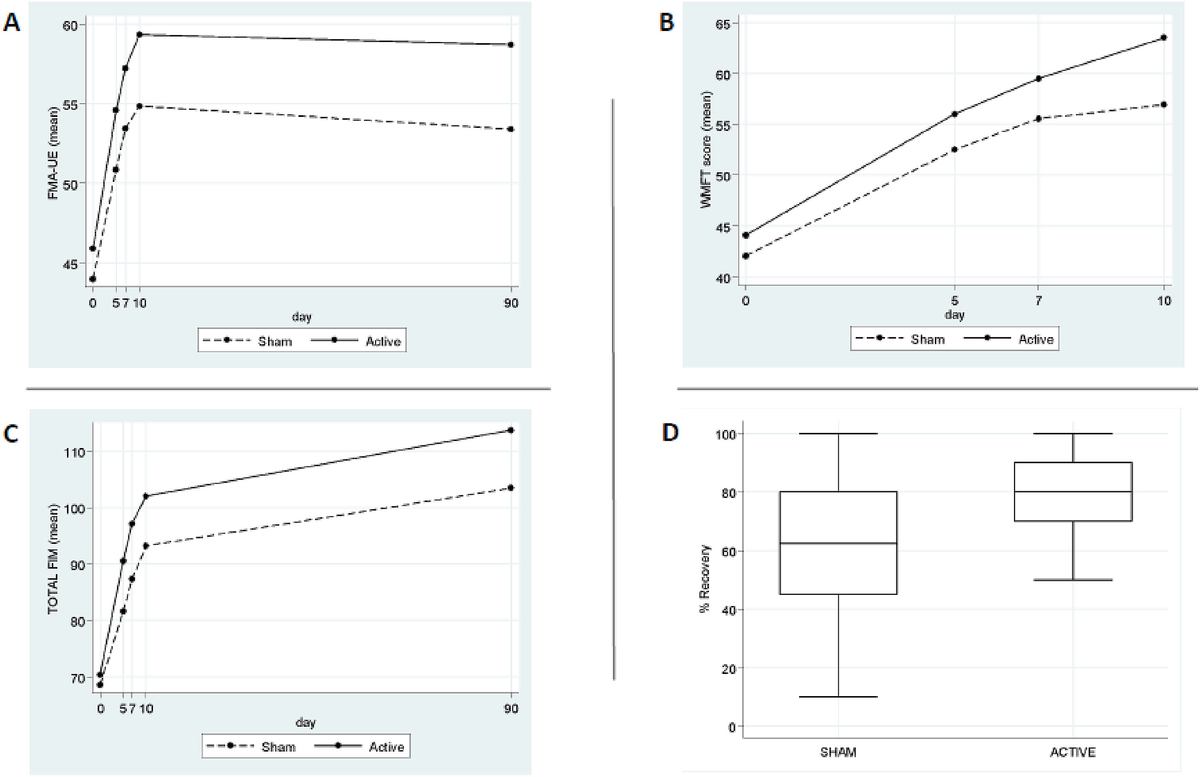 Early transcranial direct current stimulation with modified constraint-induced movement therapy for motor and functional upper limb recovery in hospitalized patients with stroke: A randomized, multicentre, double-blind, clinical trial.